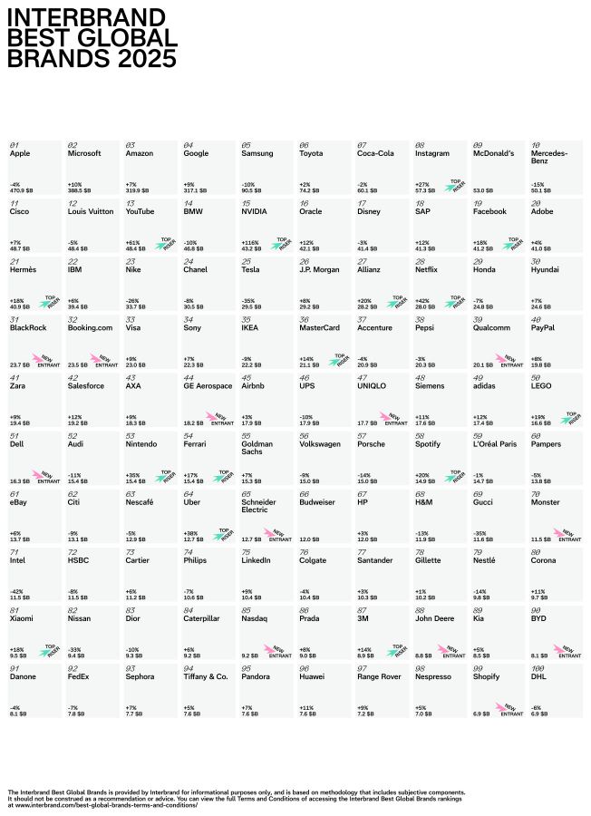 Tra i brand che sanno cavalcare l’onda dell’innovazione ci sono quelli il cui valore è in rapida ascesa all’interno della classifica: Nvidia (#15, +116%), Netflix (#28, +42%), YouTube (#13, +61%), Uber (#64, +38%), Nintendo (#53, +35%) e Instagram (#8, +27%). Come pure BlackRock (#31), Booking.com (#32), Qualcomm (#39), GEAerospace (#44), Uniqlo (#47), Schneider Electric (#65), Monster (#70), Nasdaq (#85), Byd (#90) e Shopify (#99), che hanno fatto il loro ingresso nella Best Global Brands 2025, segnando il numero di debutti più alto di sempre.