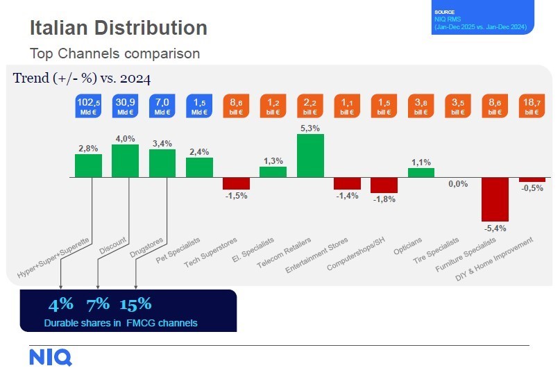 La crescita non è stata uniforme nemmeno tra i diversi formati distributivi. L’analisi NIQ evidenzia buone performance per discount (+4%), superstore (+3,4%) e specialisti drug (+3,4%). Al di fuori del largo consumo, si distinguono i negozi di telefonia (+5,3%) e i pet specialist (+2,4%). In sofferenza i negozi specializzati nell’arredo (-5,4%) e in prodotti informatici (-1,8%).
